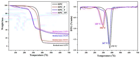 | Sample | Samples Mass (mg) | W% | Total Weight Loss at 700 °C (Residue, %) | T Onset (°C) | T Endset (°C) | T Peak (DTG/°C) |