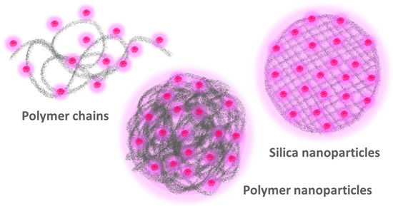 The more commonly used approaches to obtaining highly fluorescent polymer nanomaterials by incorporating a large number of fluorescent dyes are to attach the dyes to individual polymer chains (left) and to encapsulate the dyes in polymer (center) or silica (right) nanoparticles.