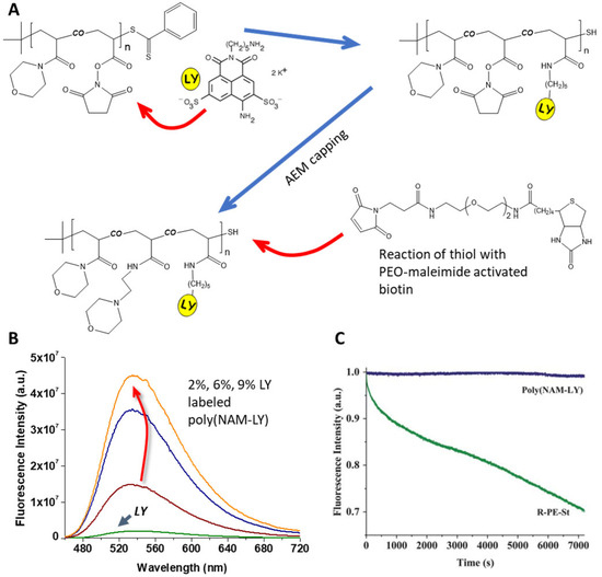 Another strategy is to copolymerize a reactive monomer, which can be later used to couple a fluorescent group to the polymer. In this case, the different monomers involved should have very similar reactivity ratios to guarantee a homogeneous distribution of the reactive monomers along the polymer chain [70,71]. This results in a homogeneous dye distribution, which, in the absence of other quenching groups in the polymer [72], allows the development of fluorescent polymer probes with very high brightness. From the few examples described in the literature, one successful example is a bright fluorescent water-soluble reporter based on a statistical polymer of N-acryloylmorpholine (NAM) and N-acryloxysuccinimide (NAS), end-functionalized with biotin (a biomolecule for biotin–avidin click chemistry), prepared by RAFT polymerization (Figure 3) [16]. Using the NAS monomer units, the chains were further labeled with 7 to 62 lucifer yellow (LY) fluorophores per polymer chain, yielding polymers with low fluorescence self-quenching and a 7- to 43-fold increase in brightness compared to free LY [16]. The polymer chains have precisely controlled architecture, very low size dispersity, random dye distribution, good resistance to photobleaching, no sensitivity to pH, and feature a chain-end biotin ligand to promote specific recognition with the streptavidin protein [73,74,75], leading to the development of polymer probes for signal amplification in biosensing assays, labeling of cell biotin receptors in cancer studies, labeling of antibodies, and microscopy imaging [76,77,78].