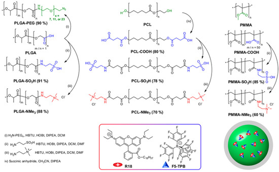 Synthesis of dye-loaded NPs by charge-controlled nanoprecipitation of poly(d,l-lactide-co-glycolide) (PLGA) with a carboxylate group at one chain end, polycaprolactone (PCL) with hydroxyl groups at both chain ends, and a copolymer of poly(methyl methacrylate) (PMMA) with methacrylic acid were modified with PEG, carboxylate, sulfonate, and trimethylammonium groups. A salt of rhodamine B octadecyl ester (R18) with tetrakis(pentafluorophenyl)borate (F5-TPB) as a counterion was used as dye for encapsulation (Adapted with permission from Ref. [85] Copyright American Chemical Society).