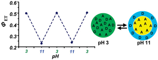 FRET two-component polymer nanoparticles undergo reversible morphology transformation in water as a function of pH. The particles consist of a high molecular weight acrylate copolymer and an acid-rich oligomer designed to be miscible with the polymer when its carboxylic groups are protonated. Attaching a pair of fluorescence resonance energy transfer (FRET) dyes to the components inside the nanoparticles enabled the determination of the particle morphology at the molecular level, showing that the components are miscible in acidic conditions (higher FRET efficiency, ϕET) but undergo charge-induced phase separation (lower ϕET) when the oligomers are neutralized to their carboxylate form (Adapted with permission from Ref. [93] Copyright American Chemical Society).