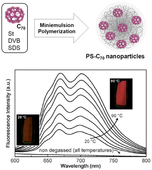 Miniemulsion polymerization offers lower control over particle size than emulsion polymerization but is much better suited for the encapsulation of hydrophobic molecules such as fluorescent dyes. The nanoparticles obtained by miniemulsion polymerization can be smaller than those obtained by emulsion polymerization (ca. 30 to 200 nm). In miniemulsion polymerizations, the droplet size is reduced by applying high shear forces (mechanical stirring or sonication), with the droplets stabilized by a surfactant and a water-insoluble co-stabilizer (e.g., hexadecane) [94]. The polymerization occurs inside the monomer droplets, which directly originate the nanoparticles. Therefore, dyes or other hydrophobic molecules initially present in the monomer droplets become encapsulated in the resulting nanoparticles. Miniemulsion polymerization is especially useful for the encapsulation of dyes that cannot be functionalized without affecting their optical properties, as in the case of fullerenes. In one example, C70 was successfully incorporated into polystyrene nanoparticles (PS) by miniemulsion polymerization so that the nanoparticles could be incorporated into different materials where C70 is not dispersible. Moreover, the strong temperature dependence of the thermally activated delayed fluorescence (TADF) of C70 was maintained in the PS-C70 nanoparticles (Figure 6) [95,96]. However, monomer-modified dyes have also been encapsulated by copolymerization in miniemulsions [97].