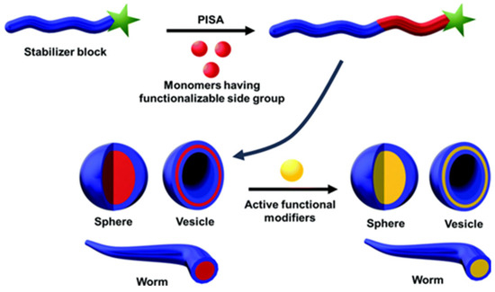 Nanostructures produced by polymerization-induced self-assembling (PISA). The structures are self-assembled in situ during the formation of a diblock copolymer with a core-forming block and an outer block providing colloidal stability, followed by post-functionalization with an active functional modifier (adapted with permission from Ref. [102] Copyright Royal Society of Chemistry).