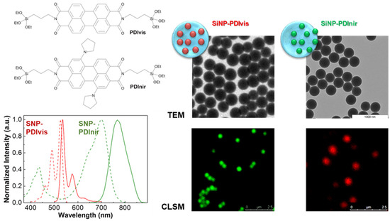 Perylenediimide (PDI) derivatives for anchoring to the silica structure (top left), one with emission in the visible region of the spectrum (PDIvis) and the other emitting in the NIR (PDInir), with the corresponding normalized absorption spectra (dashed lines) and fluorescence spectra (solid lines) measured in 1,4-dioxane (bottom left). TEM and laser scanning confocal fluorescence microscopy (LSCFM) images (pseudo color) of silica nanoparticles labeled with PDIvis and SiNP-PDInir (right), cast onto a glass slide. The dyes were homogeneously incorporated into monodisperse silica nanoparticles with diameters of ca. 30 to 300 nm, yielding very brightly fluorescent silica nanoparticles, later surface-modified with arginine-glycine-aspartic acid (RGD) tumor-targeting oligopeptides [113,120].