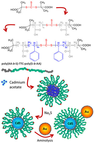Emission enhancement in constructs of quantum dot micelles (QDM) of Cadmium Sulfide (CdS) and gold nanoparticles (GNP, in yellow). Top to bottom: RAFT polymerization of a 4-block copolymer, starting from the S,S′-bis(α,α′-dimethyl-α″-acetic acid) trithiocarbonate (TTC) chain transfer agent, grows first the external poly(acrylic acid) blocks (PAA), followed by polymerization of the internal polystyrene blocks (PS). The resulting copolymer (PAA-b-PS-TTC-PS-b-PAA) self-assembles in 1,4dioxane by adding cadmium acetate, forming micelle nanoreactors. CdS quantum dots are then obtained by adding Na2S. The micelle shell TTC groups (red dots) are converted into thiol groups (yellow dots) by adding hexylamine and used to anchor the GNPs. (Adapted with permission from Ref. [131] Copyright American Chemical Society).