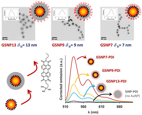 In another example, low-porosity silica was used as a rigid spacer to completely prevent contact between dyes and GNPs, offering excellent control over the dye-metal distance [51]. Other advantages of using silica to encapsulate the GNPs are its robustness, chemical stability, and versatility of surface modification (for example, for the conjugation of biomolecules or dyes [141]). To control the dye-metal distance, a hybrid system was developed with a GNP core and a silica shell of precise thickness. A perylenediimide (PDI) dye derivative with absorption and emission spectra overlapping the SPR of the GNPs and a very high fluorescence quantum yield was covalently attached to the silica outer surface. With this system, it was possible to precisely calculate the emission enhancement for different well-defined dye-metal constructs in dispersion (Figure 12) [51].