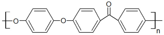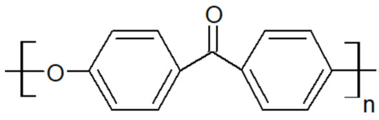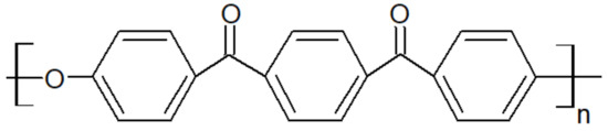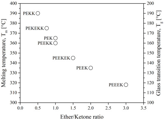 The properties of polyaryletherketones are due to the occurrence of phenylene rings linked via oxygen bridges (ether, R–O–R) and carbonyl groups (ketone, R-CO-R) in different configurations and proportions. The glass transition temperature, Tg, and the melting temperature, Tm, of the polymer depend on the ratio and sequence of ethers and ketones. They also affect its heat resistance and processing temperature. The lower the ratio of ether/ketone, the more rigid the polymer chain is and the higher the Tg and Tm as seen in Figure 4. As a consequence, the processing temperature ranges from 350 °C to 400 °C [15]. The main suppliers are Victrex, Arkema, Solvay, Evonik, Sabic and Gharda.