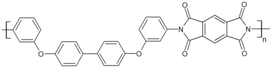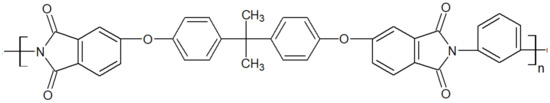 Thermoplastic polyimides, whose structure is depicted in Figure 10, display high mechanical properties of 128.7 MPa at tensile strength and 14.2% at elongation at break for TPI-4 [42]. They have one of the highest continuous operating temperatures for an unfiled thermoplastic of 240 °C [43]. Their Tg is at 250 °C. The main drawbacks of TPI are their high melt viscosity and low chemical resistance, making their processing challenging. Modification of the aromatic backbone by the inclusion of flexible functional bonds has enabled the synthesis of polyimide with a lower melt viscosity [44,45]. While TPIs are amorphous (Matrimid 5218, LaRC-TPI, Extem XH/UH), semicrystalline TPIs (with a crystallinity at 20%) were developed as an alternative, such as the so-called “New-TPI” by Mitsui Toatsu Chemical, Inc. (Tokyo, Japan) [46], later renamed “Aurum” or “Regulus” [47] depending on its end-use. Both amorphous and semicrystalline TPI suffer from low processability, even though the N-TPI has better overall mechanical properties and chemical resistance than TPI. Blending TPI or N-TPI with PAEK is an interesting way to improve the processability of the former, despite their immiscibility with PAEK.