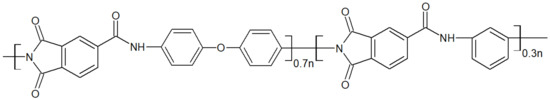 Most studies with polyamideimides mention Torlon® 4000T from Solvay, whose chemical structure is presented in Figure 7, as well as other PAI Torlon®. Torlon® 4000T is the unfilled PAI powder mainly for adhesive applications [32]. Some authors have synthesized their PAI [33] with specific properties. Their mechanical, thermal and oxidative properties make them suitable for various applications thanks to a high glass transition temperature of around 275 °C [34].