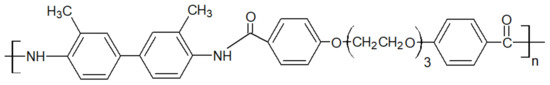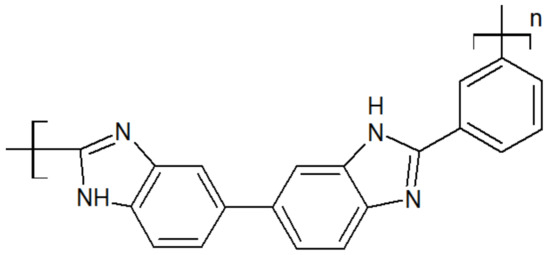 The chemical structure of polybenzimidazole is presented in Figure 8. Its rigid structure gives excellent thermal and mechanical properties, such as a melting point above 600 °C [35] and a glass transition of 435 °C [36]. It has the highest tensile strength among high-performance polymers, up to 145 MPa, and offers good chemical resistance [35,37,38,39]. However, it has a large water uptake of 15 wt.%, and the imidazole ring in the repeat unit may be subjected to hydrolysis, reducing its lifetime in applications such as fuel cells [40].