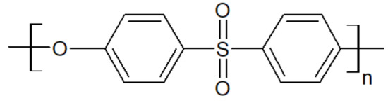 Polyethersulfone, whose chemical structure is sketched in Figure 9, is an amorphous thermoplastic with a Tg between 190 °C and 230 °C, yielding high thermal stability. It also offers high mechanical rigidity and creep resistance, which make it a good candidate to blend with PAEK [41].