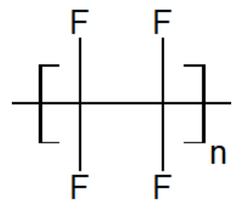 Polytetrafluoroethylene is a synthetic fluorocarbon with a high molecular weight compound consisting of carbon and fluorine. Their structure is shown in Figure 11. It is highly hydrophobic, biocompatible and widely used as a solid lubricant thanks to its low friction coefficient. Concerning engineering applications, PEEK is wear-resistant but may suffer from wear loss or high friction coefficient at elevated temperatures. Blending PEEK with PTFE is a way to improve the tribological performances of PAEK-based blends. But PTFE is extremely viscous in the melted state, which complicates its processability. Its glass transition temperature is around 114 °C and its melting point is 320 °C and it starts deteriorating above 260 °C, making it difficult to blend with PAEK.