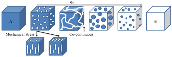 - Nanoparticles, which are partially or fully miscible with the polymers in the blend [57]. Usually, they are amphiphilic, “Janus” nanoparticles [58] aimed at the interface to reinforce it and promote the stress transfer between the two phases;