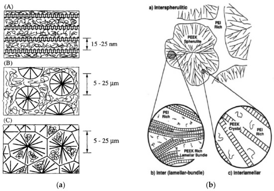 - Cold crystallization of PAEK blends was reported not to occur for PEI content from 75 wt.% [61,101], for which the PEI impacts and hinders the PEEK crystallization. Below this concentration, the PEI does not influence the PEEK crystallinity [20]. A decrease in the crystallization with increasing PEI content was measured [20,21,26,61,62,100,104,111,112], attributed to a rejection of PEI into the amorphous domains of PEEK [20]. The final degree of crystallinity of the PEEK reached in the blends did not change with the PEI content and in some cases slightly increased [20,21,26,62,101,111]. The PEEK crystallized similarly to that of pure PEEK, and the melting temperature was not affected by the PEI content.