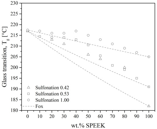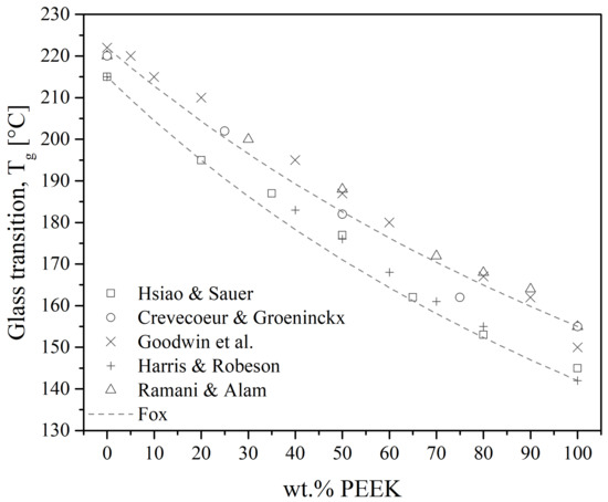 Polyetheretherketone/polyetherimide blends are the most studied among the PAEK/PEI blends since they are easily obtained by melt-mixing. They give fully miscible blends at all compositions in the amorphous state. Indeed, all reports reviewed measured a single Tg on quenched samples, either using DSC or DMTA [19,20,25,27,28,29,30,61,62,100,101,102,103,104], over the whole range of composition. Good agreement between the values of the measured Tg and Fox equation is found in those works, as illustrated in Figure 15.
