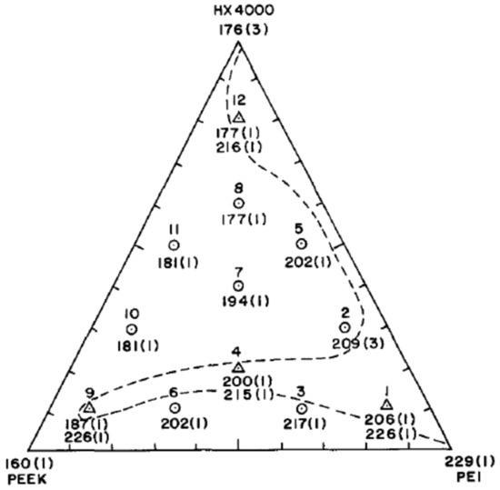 - Morales, A.R.; Bretas, R.E.S. Polyetherimide/poly(ether ether ketone)/liquid crystalline polymer ternary blends-II. Approximited interaction parameters and phase diagrams. Eur. Polym. J. 1996, 32, 365–373. [Google Scholar] [CrossRef]