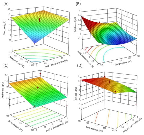 Response surface of the main sugars analyzed as a function of sulfuric acid concentration and temperature. Time fixed at 120 min: (A) glucose; (B) cellobiose; (C) arabinose; (D) xylose. Dots are the real values.
