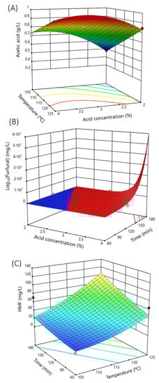 Response surface of the main microbial growth inhibitors analyzed as a function of main hydrolysis variables (sulfuric acid concentration, temperature, or time). (A) Response surface of acetic acid at 120 min of hydrolysis time. (B) Response surface of furfural at a hydrolysis temperature of 125 °C. (C) Response surface of 5-(hydroxymethyl)-2-furaldehyde (HMF) at 3% sulfuric acid concentration. Dots are the real values.
