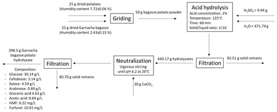 Therefore, mixing non-commercial potato waste with grape bagasse could be a promising alternative to obtain a low-cost culture media with high glucose concentration and optimal nutrients and micronutrient profiles for biotechnology fermentations. Culture media based on discarded potato and Garnacha grape bagasse was proposed with a ratio of 50:50 (w/w). The hydrolysis treatment was carried out at 125 °C for 60 min with 2% sulfuric acid concentration, according to the optimized hydrolysis for Garnacha grape bagasse. The overall process with the mass balance is shown in Figure 3.