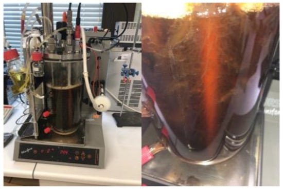 Figure 5 shows the airlift bioreactor with a detail of the BC produced as fibers. A sample of the fermentation medium was taken every 24 h to analyze the content of the main compounds.