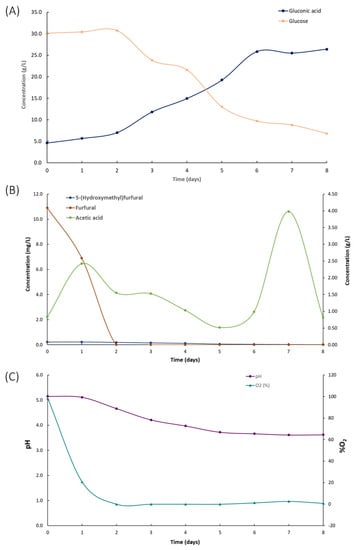 Kinetics in the composition of the culture medium by the fermentation of Komagateibacter xylinus in a culture medium based on Garnacha Tintorera grape bagasse and discarded potatoes. (A) Glucose and gluconic acid concentrations; (B) microbial growth inhibitors; (C) pH and dissolved O2.