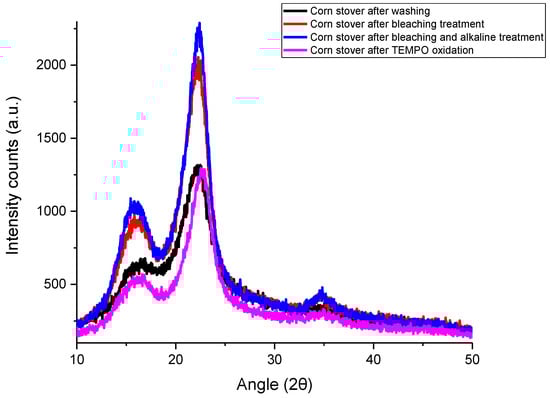 Figure 1 shows the XRD patterns of corn stover samples after each treatment. Corn stover after washing had three reflection peaks at 2θ = 16.5°, 22.2° and 35.1°. These peaks had also been reported by Costa, Assis, Gomes, da Silva, Fonsêca and Druzian [21] for corn stover samples, and these peaks are characteristics of cellulose I crystals. The peaks at 2θ = 16.5° and 22.2° correspond to (110) and (002) crystallographic planes, respectively [21,27]. The peak at 35.1° corresponds to (004) planes [27]. After the removal of lignin and hemicellulose by bleaching and alkaline treatment, narrower crystalline peaks were observed and the intensities of peaks were more defined. Similar phenomena were observed for corn stover samples [21] and corn husks [27].