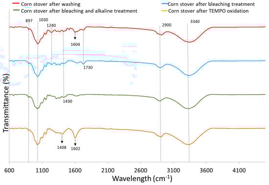 Figure 2 shows the FTIR spectrum of corn stover samples after each treatment. The peaks found between 890 and 1100 cm−1 have been reported to be associated with the C-H vibration and C-O stretch of cellulose [37]. Specifically, the small peak at 897 cm−1 represents the β-glycosidic linkage of cellulose [38]. The significant peaks displayed by all samples at around 1030 cm−1 indicate the C-O stretch bonds characteristic of esters, confirming the cellulose structure of samples. The peaks observed at around 1240 cm−1 for corn stover after washing (CS) and corn stover after bleaching treatment (CS-BT) denote the aryl group of lignin whereas it is not found for the alkaline treated sample and TEMPO-CNF, indicating the removal of lignin. The peak at 1430 cm−1 referring to symmetrical CH2 bending is present for CS, CS-BT, as well as corn stover after bleaching and alkaline treatment (CS-BAT) samples, but the peak shifted to 1408 cm−1 in the corn stover after TEMPO oxidation (TEMPO-CNF) sample indicating the formation of new hydrogen bonds [38].