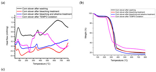 According to Figure 3b,c, at temperatures above 200 °C, TEMPO-CNF showed two weight loss events, corresponding to two peaks in the DTG curve. Specifically, cellulosic materials with surface groups typically have two weight loss events, with the first weight loss event attributing to the surface charge group (i.e., the carboxyl group in this study) and the second weight loss event attributing to the hydroxyl group [46]. The weight loss pattern of corn stover-derived TEMPO-CNF in this study is similar to that of TEMPO-oxidized bagasse pulp [47] and TEMPO-oxidized rice straw cellulose [34]. In addition, according to Figure 3a, TEMPO-CNF has a much broader exothermal peak than other samples. Specifically, TEMPO-CNF had a broad exothermal peak at around 384 °C, while other corn stover samples had a narrower peak at 338~363 °C. The broad exothermal peak was also observed in TEMPO-oxidized rice straw cellulose [34], as well as cellulose and nanocellulose prepared from Betel nut fruit husk fibers [48].