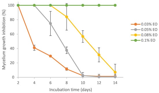 Results from Figure 5 show that lemongrass essential oil could effectively inhibit the mycelial growth of Aspergillus flavus. Complete colony growth (~8 cm) on the plate was observed for the control (0% EO) by day 8 (result not shown). In comparison, treatment at 0.03%, 0.05%, 0.08% and 0.1% EO resulted in 11%, 38%, 84% and 100% inhibition of mycelium growth at day 8, respectively. On day 14, the mycelial growth inhibition (MGI) rate was reduced to 7% in the presence of 0.08% EO. Lemongrass essential oil at 0.1% exhibited 100% inhibition against A. flavus growth for 14 days. Similarly, the fungicidal and anti-aflatoxigenic effects of lemongrass essential oil against A. flavus were also reported by others [56,57]. Specifically, the essential oil of Cymbopogon citratus (DC.) Stapf. (lemongrass) was fungistatic and fungicidal against A. flavus at concentrations of 0.6 mg/mL and 1.0 mg/mL, respectively. In addition, lemongrass essential oil was also reported to be one of the top three in the highest antifungal activity among 11 essential oils [58].
