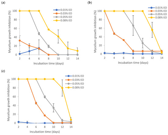 The effectiveness of nanoencapsulated essential oil was determined by the in vitro inhibition of mycelial growth using the ‘poison food’ technique [26] with some modifications. Four sample groups were tested, including EO, EO + W, EO + T80 and EO + T80 + TCNF. The emulsion samples were prepared as described in Section 2.5. Pure EO was studied as a comparison. Potato dextrose agar (PDA) containing 0.1% (v/v) Tween 80 was prepared and used as the media. Once media was autoclaved, it was placed in a water bath and maintained at a temperature of 55 °C. Then certain volumes of EO or parent emulsion were added to a cool, sterile molten PDA medium to achieve certain EO concentrations. Aspergillus flavus (ATCC® 200026™) was inoculated with a volume of 10 μL (105 conidia/mL) on the dried PDA plates. Plates were incubated at 25 °C, and the diameter of mycelium growth was recorded over 14 days. Four replicates (with 2 plates per replicate) were performed for each sample. A. flavus conidia was prepared by scraping off the agar surface of 14-day-old culture and suspended in sterile water, followed by counting using a hemocytometer. The fungicidal activity of the samples was determined based on the percentage of mycelial growth inhibition (MGI) using the equation below.