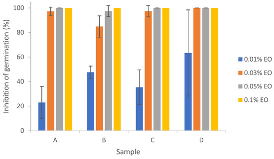 Results from Figure 7 show that 0.03%~0.1% lemongrass essential oil with or without encapsulation was effective in inhibiting the germination of Aspergillus flavus, with percent inhibition of germination (IG%) around 100%. Significant differences in IG% were found between 0.01% EO and EO concentrations ≥ 0.03%. There did not exist any significant differences between pure EO (D) and encapsulated EO (A, B, or C), indicating that the emulsion stabilizers and/or sonication did not significantly impact the action of EO on inhibition of conidial germination of Aspergillus flavus. Antifungal effects of lemongrass essential oil on the conidial germination of other fungi (e.g., Cladosporium herbarum) at an EO concentration of 0.5% have been previously reported [26]. Complete inhibition of A. flavus germination could also be achieved by other citrus EOs like bitter orange and bergamot at 2% [26].