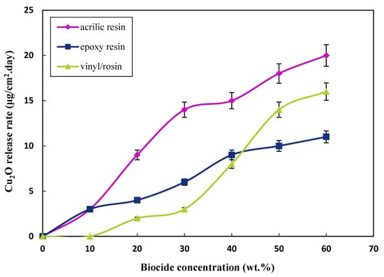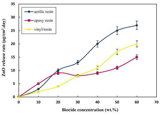 Figure 1 and Figure 2 show the relationship between the content of the biocides and the mean release rate of Cu2O and ZnO in a steady-state condition; steady-state refers to the biocide release rate after five days, when the release rate reached an almost constant rate for all prepared resins. Considering Figure 1 and Figure 2 and Table 4, it can be seen that the release rate increased linearly with the increase of the content of biocides; however, at higher contents, the release rate almost reached a fixed state, and no remarkable change was seen. This is highlighted more for acrylic resin, since the amount of biocide available in each layer of paint remained fixed after 40 wt.% content of biocides. The mechanism of this type of paint is the simultaneous dissolution of the paint layer and biocides; thus, increasing the content of biocides did not affect the available amount of biocides in the most superficial layer of the dissolving paint. In the case of epoxy and vinyl paints, the release rate was fixed at higher contents since, in this type of insoluble resin, the particles are in physical contact with each other, and as the particle leaves the paint and enters seawater, a path for another particle to be exposed to the aquatic environment is created, so the release rate at high contents continues to increase slightly [].