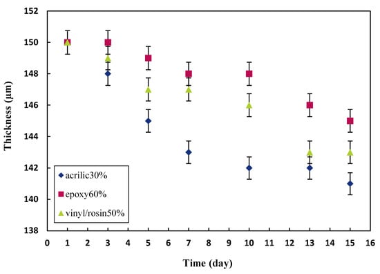 To investigate the effect of biocide release rate on the thickness of the paint layer, first, steel samples were coated with two paint substrates with a total thickness of 150 µm. Then, a layer of antifouling paint with the optimal content of each prepared resin was applied (Table 5). The backs of the samples were covered entirely with a chlorinated rubber resin-based swimming pool coating (Pars Pamchal Co.) to prevent corrosion and errors in the release rate calculations. The release rate experiments were carried out, and the thickness of the paints was measured for 15 days (Figure 3). As shown in Figure 3, the largest reduction in thickness over time was related to acrylic resin, which was due to the hydrolyzable nature of the resin.