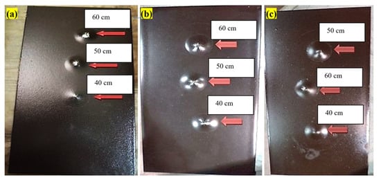 The impact resistance tests were conducted utilizing an impact resistance machine (HD-A520, Haida international, Dongguan, China) based on the ASTM D1794 standard []. In this test, the deformation of the coating was evaluated with a 2-pound ball released from different heights. Three samples were prepared for each test.
