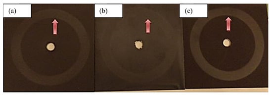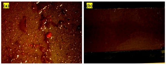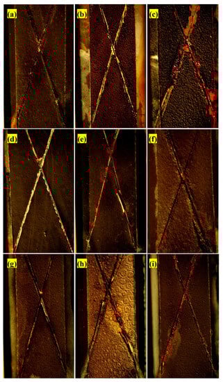 The curing time for acrylic-based and vinyl/rosin-based paints was in the range of 25–30 min, and no fingerprint effects were observed after this time. Epoxy-based paints had a longer curing time than the other prepared samples, and the samples were dried after 8 h, but a fingerprint effect was observed. One of the important parameters affecting the initial curing time of a coating is the type of solvent in it. In the case of vinyl and acrylic resins, the curing time was almost the same for both due to the similar evaporation time of the solvent, regardless of the nature of their chemical structure. On the other hand, the curing time of epoxy resins was longer due to the chemical reaction between the resin and the hardener. It has been previously stated [] that epoxy-based paint’s curing time is when the polymerization process is completed and the paint is at maximum hardness. In this study, the epoxy-based paints were completely dried after one week of application.