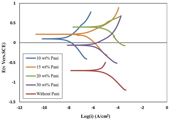 In this study, polyaniline was synthesized, and its antifouling property and efficacy against corrosion were investigated. A 20 g (0.1 mol) quantity of ammonium persulfate was dissolved as oxidizer and initiator of the polymerization reaction in 100 cm3 of an aqueous 1 M perchlorate acid solution. A 0.1 mol quantity of double-distilled aniline (10 g) in 100 cm3 of an aqueous 1 M perchlorate acid solution was dissolved. The initiator solution was added dropwise to the monomer solution, and the reaction temperature was stabilized at 0 °C. The primer solution was added to the polymerization container within 1 h, and the reaction mixture was stirred with a magnetic stirrer. After this time, the contents of the container, which contained a blackish-green precipitate, were filtered through a Buchner funnel. The resulting polymer was washed under filtration with methanol. The polymer was then washed with distilled water to remove residual methanol and dried in an oven for one day. After the synthesis of polyaniline powder, it was mixed with dimethylformamide as a solvent in a ratio of 1:1. Previous studies added different amounts of polyaniline/acid to the paint [,]; however, the best performance in increasing the corrosion resistance and antifouling qualities has been obtained in the range of 10–20 wt.% []. Therefore, 30 wt.% epoxy-based antifouling paints were prepared with the addition of 10, 15, 20, or 30 wt.% of polyaniline/acid. The prepared antifouling paints were applied to the surface of the steel with a thickness of 150 µm, and the results of the polarization and impedance tests were compared with the sample without polyaniline. Then, the optimal content of polyaniline added to the paint was determined.