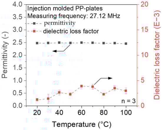 The dielectric material permittivity and dielectric loss factor are decisive for the dielectric heating of a material inside the RF-heating process. Therefore, the permittivity and dielectric loss factor of the injection-molded samples in a dry state were measured with a Keysight E4990A Impedance Analyzer from Keysight Technologies, Inc. (Santa Rosa, CA, USA) in combination with a Keysight 16451B Dielectric Test Fixture. Both the impedance analyzer and test fixture are specified for frequencies up to 30 MHz. In accordance with DIN-EN 62631-2-1 [17], the dielectric measurements were performed at a frequency of 27.12 MHz. In the following, the permittivity will be given without units, while the loss factor will be specified by milliunits (mU). Since the dielectric material properties are temperature dependent, the measurements were also carried out at elevated temperatures. To do so, the test fixture and the samples were placed inside a convection oven of the type Heratherm OMH 100 from Thermo Fisher Scientific Inc. (Waltham, MA, USA). The investigated temperature range of 20 to 100 °C was divided into 10 °C steps. To avoid damage to the test fixture caused by high temperatures, the maximum temperature was set to 100 °C.