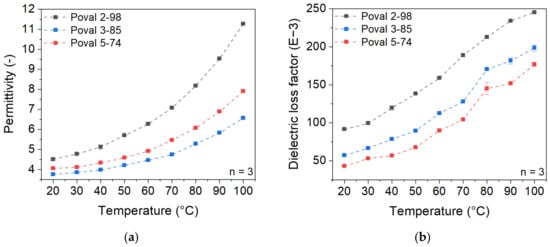 The temperature dependency of both permittivity and dielectric loss factor can be explained due to the higher mobility at the molecular level. With increasing temperatures, the dipoles of the polymeric chain can align more easily with the external electrical field. At the same time, the number of dipoles is related to the PVA’s degree of saponification.