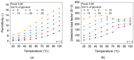 The influence of the added plasticizer on the dielectric properties of Poval 3-85 is displayed in Figure 4. In relation to the permittivity, the glycerol used causes an increase in the value, which manifests as a vertical shift to higher values at the same temperature. While unmodified Poval 3-85 has a permittivity of 4.05 at 20 °C, the value is raised to 6.51 for Poval 3-85 with 25 vol-% glycerol. When the measuring temperature is increased, the unmodified PVA material shows an exponential increase in permittivity. The rising proportion of glycerol causes a constant change to become a more linear increase. In addition, glycerol causes a slight increase in the slope, resulting in a higher deviation of the various materials at 100 °C compared to 20 °C. At 100 °C, the permittivity ranges from 7.90 to 16.65 due to the influence of the amount of glycerol used.
