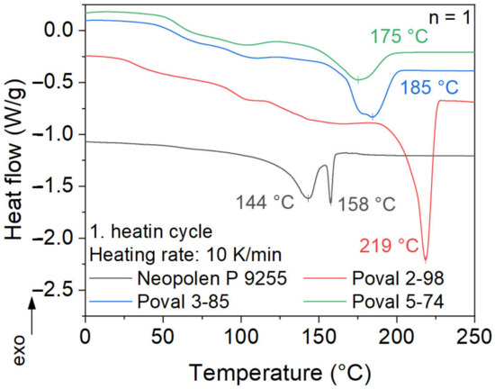 The melting behavior of ePP and all unmodified PVA materials is shown in Figure 5. For the different PVA materials, a clear correlation between peak melting temperature and the degree of saponification is visible. Poval 5-74 shows the lowest melting peak temperature of 175 °C. With an increasing amount of OH- side groups, the melting temperature shifts to higher temperatures. This results in a variation of 42 °C between Poval 5-74 and Poval 2-98. The increased amount of OH- side groups in Poval 2-98 results in a much sharper and lower melting peak compared to the other PVAs. In addition, the melting enthalpy increases with a rising degree of saponification. This results in a higher required amount of total energy to melt Poval 2-98 compared to the other PVAs tested.