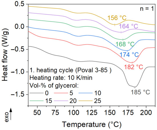 The modification of PVA with glycerol results in a shift of the melting peak to lower temperatures, as displayed in Figure 6. While the unmodified Poval 3-85 has a melting peak at 185 °C, the peak temperature is lowered by nearly 30 °C to 156 °C by a glycerol content of 25 vol-%. At the same time, the melting enthalpy decreases with increasing glycerol content. On the one hand, this is related to the substitution of PVA by the plasticizer, resulting in an overall lower amount of crystallized material. On the other hand, a reduction in the intermolecular interaction of the PVA chains may be assumed. Thus, the modification of PVA with glycerol results in a lower total temperature and, at the same time, a reduced amount of energy consumed to transfer the material from a crystalline to a molten state. Both changes in melting behavior are advantageous regarding reduced energy consumption. This results in shorter possible cycle times and lower energy consumption.