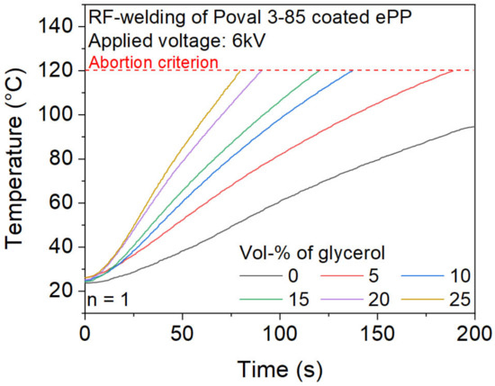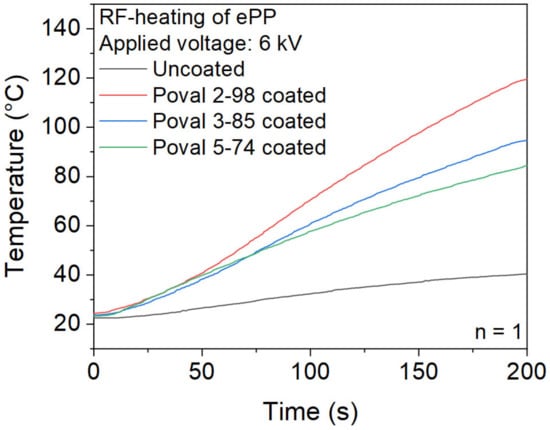 First, a comparison of uncoated ePP particles and glycerol-free PVA coatings is displayed in Figure 7. It becomes clear that heating uncoated ePP foam particles for a maximum heating time of 200 s at a voltage of 6 kV results in a negligible temperature rise. The reached temperature of 40.4 °C is far from the required temperatures to achieve a partial melting of the ePP particles required for the welding. The reduced heating behavior correlates with the measured dielectric loss factor of the ePP base material.