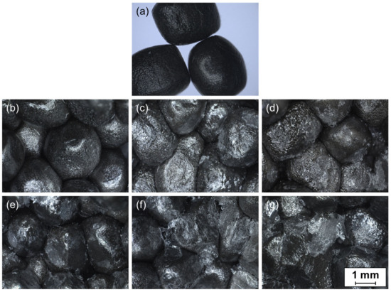 The addition of glycerol to the PVA coating results in a higher amount of formed links between the foam particles, as shown in Figure 9c compared to Figure 9e–g for Poval 3-85. This could be due to the lower melting temperatures and the required amount of energy to melt the materials. At the same time, the increased heating ramps might lead to higher local temperatures at the contact area of individual particles.
