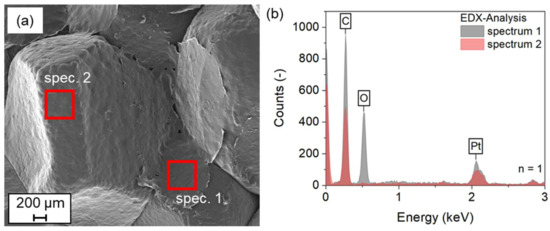 As shown in Figure 10a, the SEM image allows a detailed optical analysis of the fracture surface. It can be seen that in some areas there is a continuous layer between the particles. However, this is not the case for all areas. Rather, it can be assumed that the coating is made of a particle that has been removed from the surface. At the same time, this means that a cohesive bond has formed between the coatings of the particles in contact. The formation of a network of coatings is the result. The fracture of the specimen, on the other hand, occurs along the interface between particles and coatings. This assumption can also be confirmed by EDX analysis. Oxygen can be detected in spectrum 1, which corresponds to the coating left behind by the torn-off particle. Spectrum 2, on the other hand, does not show any oxygen. Here, the surface of the ePP particle can be assumed. Since the temperatures required to melt the PVA material are above the measured 120 °C, the hypothesis of the occurrence of higher local temperatures at the contact area between the particles is supported. The higher temperatures could be achieved by the higher local amount of PVA material, with its high dielectric loss factor.