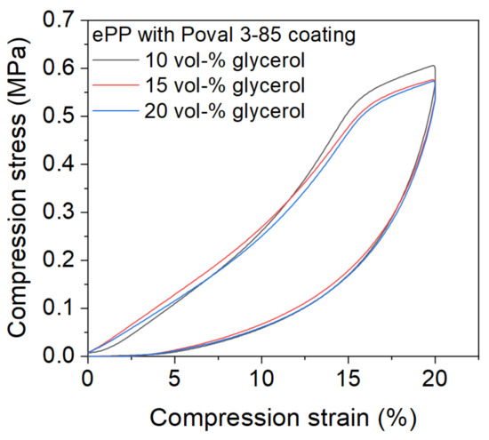 Based on the optically stable connections between the individual particles, the scope of the investigation was narrowed down to Poval 3-85 in combination with 10, 15, and 20 vol-% glycerol. Figure 11 shows the compression behavior for the compression of up to 20% of the initial sample height after three initial compression cycles were preceded. Although the connection between the foam particles is based only on the PVA coating material, none of the samples were damaged due to the mechanical load. The curves initially show an almost linear increase in compressive stress. At 15% compression strain, a reduction in the slope can be observed. This behavior is due to the three preceding load cycles, which already slightly pre-compress the material. Subsequently, the value continues to increase with a reduced slope. The maximum value is reached at a compression strain of 20% for all three materials. All tested coating combinations resulted in comparable load behavior. In addition, the maximum compression stresses were similar.