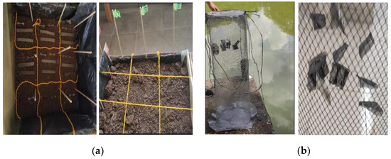 Wooden baskets of 53 × 48 × 35 cm in length, width, and height, respectively, were used in the set-up configuration. The degradation media, soil (preserving the depth profile), and compost were placed there. The samples necessary for a period of 90 days were placed equidistantly at the three depth levels (5, 10, and 20 cm), as shown in Figure 2a. In the case of water, the samples were placed inside a sample holder at a depth of 20 cm and protected by a wire-mesh cylinder, as shown in Figure 2b.