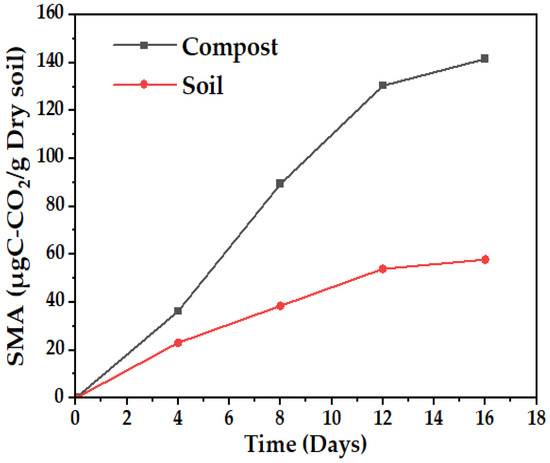 Microbial activity in the compost is more than double that of the soil, according to Figure 3, a behavior that can be explained because of the higher amount of organic matter present in the compost (12%) compared to the soil (5.075%), which represents the consumable biomass for the microorganisms present, and although there is a lower amount of nitrogen in the compost, it is more available, according to Figure S1, where the solubility of different nutrients based on pH is related.