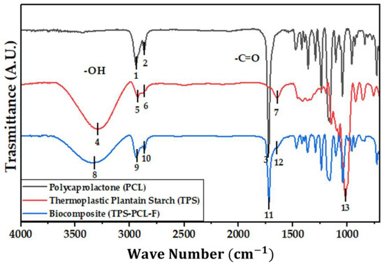 FTIR for PCL, TPS, and TPS/PCL/F biocomposite.