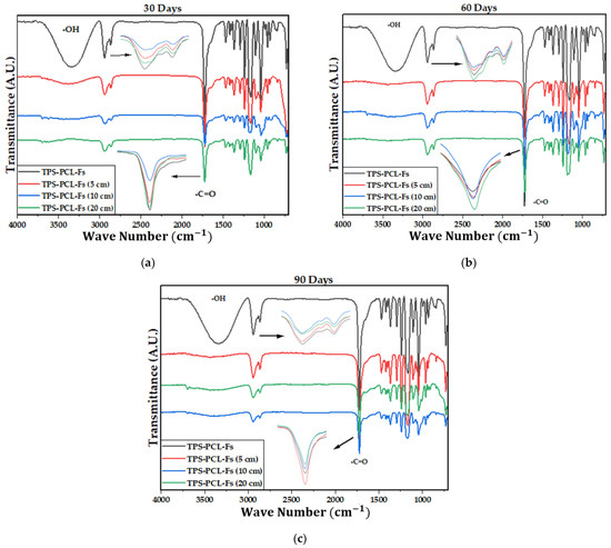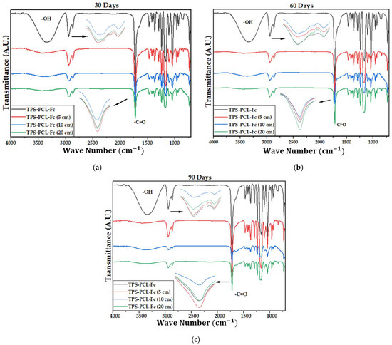 FTIR for the TPS/PCL/F biocomposite in compost at (a) 30 days, (b) 60 days, and (c) 90 days.