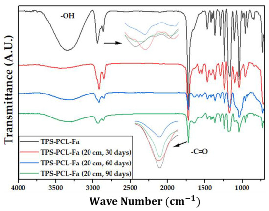 Figure 4 shows the IR spectra of the PCL, the TPS, and the biocomposite material (TPS/PCL/F). The last IR spectra are the reference for analysis of this study. In Table 4, the bands of higher intensity are related to the types of vibrations associated with the functional groups present [41,42]. Figure 5, Figure 6 and Figure 7 show the FTIR spectra of the biocomposite samples in the three degradation media at different depths (5, 10, and 20 cm), in an evaluation period of 3 months.